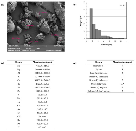 Certified reference material No. 28; China fine dust particulate matter (PM) was used for the experiments. Mori et al. (2008) reported the detailed procedures for the collection of particulate matter through mechanical vibration and the chemical characterization [26]. Scanning electron microscope imaging was conducted in order to evaluate the particle size and distribution (Figure 1a). It was evident that the majority of particles possessed a diameter less than 5 µm. Furthermore, we referred to the data provided by the National Institute for Environmental Studies (NIES), Ibaraki, Japan, and supply them below in Figure 1b–d for reference.