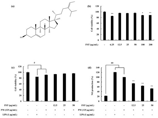 (a) Fucosterol (FST) skeletal formula, (b) cytotoxicity data for the FST sample against macrophages, (c) cell viability and (d) NO production of RAW macrophages against PM/LPS-stimulated conditions and the potential of FST to inhibit them. Cells were seeded and treated with FST after 24 h, incubated for 1 h and then co-treated with PM (125 µg/mL)/LPS (1 µg/mL). Triplicated experiments were used to evaluate the data. The results are represented as the mean ± SD. * p < 0.05, ** p < 0.01. # Denotes significance compared to the control, * represents significance compared to the PM treated group.