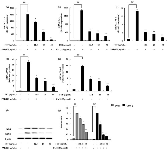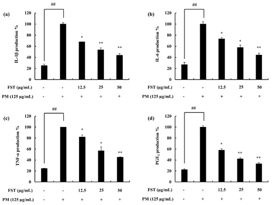 Assessing the pro-inflammatory cytokine inhibition activity of FST in PM-stimulated RAW 264.7 macrophages using enzyme-linked immunosorbent assay (ELISA) techniques. (a) Interleukin-1 (IL-1β), (b) interleukin-6 (IL-6), (c) tumor necrosis factor-α (TNF-α) and (d) prostaglandin E2 (PGE2). Culture supernatants of RAW 264.7 cells after successive treatment of PM were used to quantify the inflammatory cytokines and PGE2. Triplicated experiments were used to evaluate the data and the results are represented as the mean ± SD. * p < 0.05, ** p < 0.01. # Denotes significance compared to the control, * represents significance compared to the PM treated group.