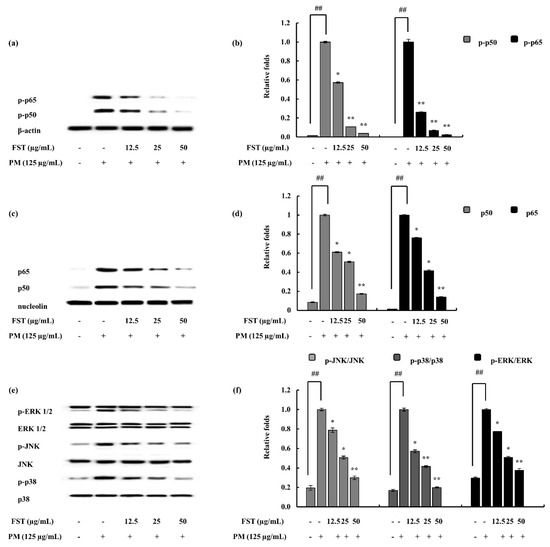 Evaluation of nuclear factor kappa-B (NF-κB) and mitogen-activated protein kinase (MAPK) pathway proteins in macrophages under PM-stimulated and FST-treated conditions. Data were obtained via Western blotting techniques and subsequent quantification of them with the use of ImageJ software. (a) p50 and p65 in cytosol, (b) quantitative data, (c) p50 and p65 in nucleus, (d) quantitative data, (e) p38, JNK and ERK and relevant (f) quantitative data. β-actin (for cytoplasm) and nucleolin (for nucleus) were used as internal controls. Results are expressed as the mean ± SD of three separate experiments. * p < 0.05, ** p < 0.01. # Denotes significance compared to the control while * represents significance compared to the PM-treated group.
