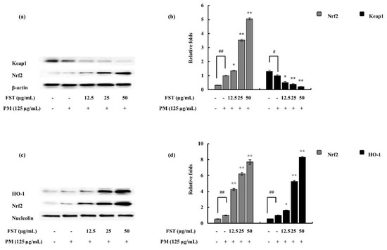 Effect of FST on PM-stimulated oxidative stress pathway-related proteins and their evaluation via Western blotting. (a) Nuclear factor erythroid 2-related factor 2 (Nrf2) and Kelch-like ECH-associated protein 1 (Keap1) in cytosol and their (b) quantitative data. (c) HO-1 and Nrf2 in the nucleus and respective (d) quantitative data. * p < 0.05, ** p < 0.01 versus the PM-treated group or # p < 0.05, ## p < 0.01 versus the un-stimulated group. β-actin (for cytoplasm) and nucleolin (for nucleus) were used as internal controls. Quantitative data were analyzed using ImageJ software. Results are expressed as the mean ± SD of three separate experiments. * p < 0.05, ** p < 0.01. # Denotes significance compared to the control while * represents significance compared to the PM-treated group.