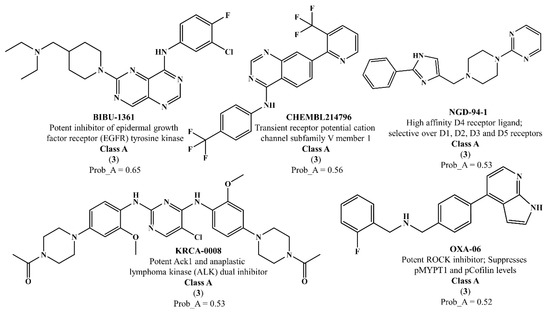 Chemical structures of the five molecules in test set 2 that were predicted as class A with the confidence value (3) and Prob_A ≥ 0.5.