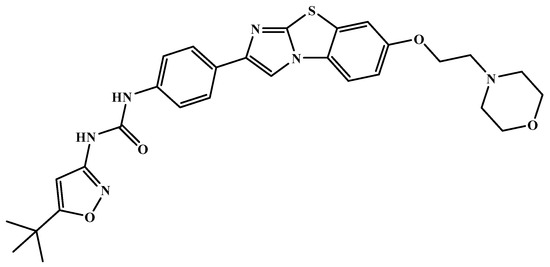 Chemical structure of quizartinib from the test set 2 that was predicted as class A with the confidence value (3) and Prob_A of 0.46, which is active in the SARS-CoV-2 CPE assay.