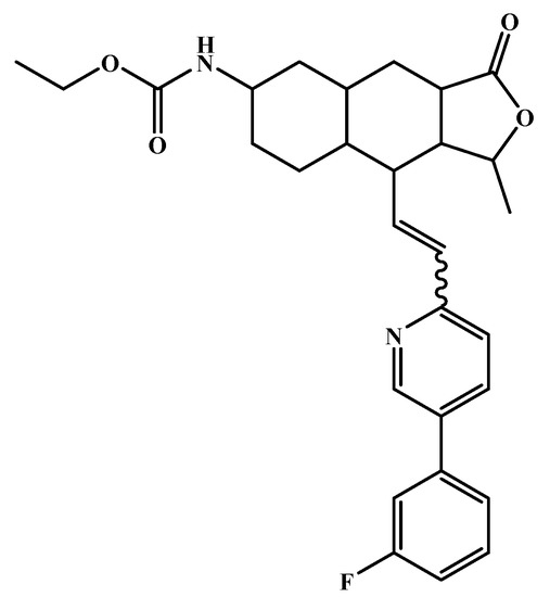 All six molecules predicted to be the most promising against SARS-CoV-2 from the test set 2 in Figure 1 and Figure 2 are N-heterocyclic molecules, four of which have a pyrimidine scaffold (BIBU-1361, CHEMBL214796, NGD-94-1, KRCA-0008), one, OXA-06, has a pyrrolo[2¨C3-b]pyridine scaffold, and quizartinib has a benzo[d]imidazo[2,1-b]thiazole scaffold. Better predictions compared to those obtained for the test set (Table 4) were obtained taking into account the results of the SARS-CoV-2 CPE assay for the 82 molecules of the test set 2 and the values of 0.21, 0.94, and 0.74 for sensitivity, specificity C, and general predictive precision, respectively. Likewise, the other 2556 molecules of the NCATS data were predicted by the CM model, obtaining 0.01, 0.01, 0.98, and 0.91 for sensitivity, specificity B, specificity C, and general predictive precision, respectively. Only one molecule, vorapaxar (Figure 3), was predicted by the QSAR model as true A.