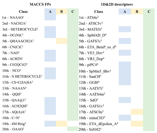 Of the twenty most important MACCS FPs for modeling the antiviral activity against SARS-CoV-2 in the set, there are more MACCS FPs (i.e., eighteen MACCS key) that are relevant in discriminating the class C than the classes A or B. For example, only the 11th, which codifies the presence of N-heterocyclic scaffold, and the 19th, which encodes the existence of a 4-membered ring, MACCS FPs out of the twenty most important FPs of MACCs are more relevant in discriminating the A and B classes, respectively. The importance of the N-heterocyclic scaffold in class A discrimination has already been highlighted in the proposed list of the six most promising molecules as antiviral against SARS-CoV-2 for test set 2, namely four molecules containing a pyrimidine scaffold, a molecule with a pyrrolo[2,3-b]pyridine scaffold, and a benzo[d]imidazo[2,1-b]thiazole scaffold. In the same way, of the twenty most important descriptors for modeling the antiviral activity against SARS-CoV-2, there are more 1D&2D descriptors that are relevant in discriminating the class C than the classes A or B (i.e., eighteen descriptors) in the set. There are two 1D&2D descriptors that are more relevant in discriminating the class A than the others classes in the set of the twenty most important 1D&2D descriptors for modelling the antiviral activity against SARS-CoV-2, Figure 4, both are topological descriptors, VR3_Dzp (logarithmic Randic-like eigenvector-based index from Barysz matrix/weighted by polarizabilities) and piPC4 (conventional bond order ID number of order 4, log scale). Despite the two most relevant 1D&2D descriptors for class B, an autocorrelation (ATSC0e, centered Broto-Moreau autocorrelation—lag 0/weighted by Sanderson electronegativities) and a topological (ETA_dEpsilon_A, a measure of contribution of unsaturation and electronegative atom count) descriptors, these are more relevant in class C discrimination.