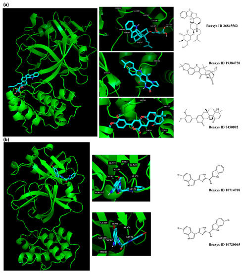 Interaction profiles of the best-docked poses for the five hits using the set search space coordinates, in which a higher affinity was accomplished (a) X: −36.149 Y: −3.796 Z: 45.045; or (b) X: −12.806 Y: 18.646 Z: 65.607.