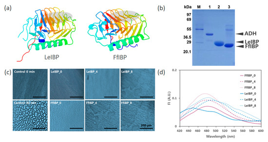 To investigate the protective effect of IBPs on freeze-labile ADH, we selected two IBPs of similar tertiary structure but of different IRI activity (Figure 1a) [18,19]. The recombinant LeIBP was about 25-fold active in IRI compared with FfIBP. As shown in Figure 1b, both IBPs were purified to near homogeneity, except for the minor contamination in the FfIBP sample, and concentrated up to 8 mg mL−1. First we examined their stability over the repeated freeze–thaw cycles. All the freeze–thaw processes in this study were performed in a household freezer with no freezing rate controller, which may maximize the freeze–thaw damage to proteins by relaxing good lab practice. The freeze–thaw damage to IBPs was examined using the IRI activity assay and the structural perturbation probed with 1-anilinonaphthalene-8-sulfonate (ANS), a hydrophobic fluorescent probe [31,32]. The IRI activity (Figure 1c) using a splat cooling assay method showed that none of freeze–thawed IBP samples (0.1 mg mL−1) were affected by the freeze–thaw cycles. The fourth and eighth repeatedly freeze–thawed Le- and FfIBP exhibited no discernible difference to unfrozen proteins in IRI. This result is not surprising because for a decade of studying IBPs, the authors have noticed no diminution of their activity over the several freeze–thaw cycles during TH measurement on a cold stage. The ANS dye binding to hydrophobic regions of a protein has been widely used to follow unfolding of a protein by a variety of stresses [32,33,34,35]. Freeze–thawed IBPs were also mixed with ANS and its emission spectra were obtained (Figure 1d). If freeze–thaw caused unfolding or perturbation in the tertiary structure of IBPs, more hydrophobic regions were exposed in IBPs that would lead to the increase in the fluorescence emission spectra of ANS. There were a slight shift and increase but no marked increase in fluorescence spectra in the freeze–thawed samples. These data were in accordance with the recent finding with a beetle AFP [10]. Very similar to this work, they acquired almost identical circular dichroism spectra of DcAFP before and after four freeze–thaw cycles. In all, we believe that both Le- and FfIBP maintain their structural and functional integrity at least up to eight repeated freeze–thaw cycles.