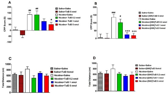 Effect of TxID and [S9K]TxID on nicotine induced CPP expression. (A,B) are mean (±SEM) CPP score (s), which was the time spent in drug-paired chamber after the injection of Nicotine/TxID/[S9K]TxID minus the initial time spent in drug-paired chamber. (C,D) are mean (±SEM) total distance (cm) during the 15-min post-conditioning session. Asterisks represent significant difference from the Nicotine + Saline group (* = p < 0.05, *** = p < 0.001), the pound sign represents significant difference from the Saline + Saline control group (# = p < 0.05, ## = p < 0.01, ### = p < 0.001).