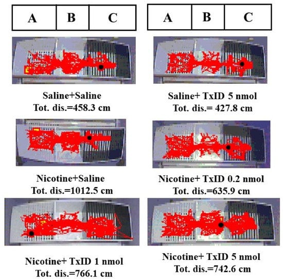 The traces of mice injected with TxID during post-conditioning test. A compartment was white. B compartment was gray and allowed to access. C compartment was black. Nicotine-paired side was white compartment. n = 1.