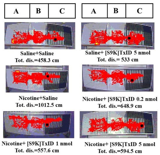The traces of mice injected with [S9K]TxID during post-conditioning test. A compartment was white. B compartment was gray and allowed to access. C compartment was black. Nicotine-paired side was white compartment. n = 1.