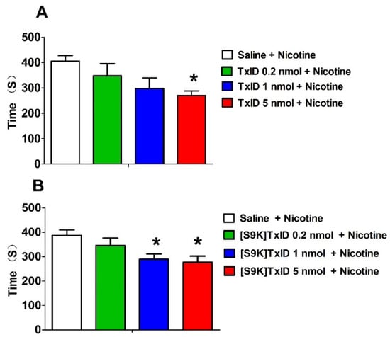 Effects of TxID (A) and [S9K]TxID (B) on nicotine-induced CPP reinstatement. Data represented mean ± SEM, n = 8–10. Time refers to the time spent in drug-paired chamber. Asterisks represent significant difference from the Saline + Nicotine group (* = p < 0.05).