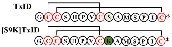 The linear peptides were obtained from GL Biochem (Shanghai, China) using Fmoc chemistry and the cysteine sidechain were protected by acetamidomethyl (Acm) and triphenylmethyl (Trt). The disulfide bonds of the linear peptides were oxidized as previously described [14]. Peptides were kept in 20 mM potassium ferricyanide (K3[Fe(CN)6]) at room temperature for 45 min to form the first disulfide bond. The closure of the second disulfide bridge was performed by iodine oxidation resulting in formation of TxID and [S9K]TxID (Figure 5). Afterwards, the bicyclic peptide was purified by a reversed-phase Vydac C18 column on the HPLC system and were confirmed by LCMS-IT-TOF mass spectrometer (Shimadzu, Kyoto, Japan).