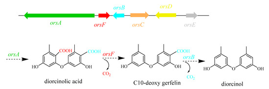 - Sanchez, J.F.; Chiang, Y.-M.; Szewczyk, E.; Davidson, A.D.; Ahuja, M.; Elizabeth Oakley, C.; Woo Bok, J.; Keller, N.; Oakley, B.R.; Wang, C.C.C. Molecular Genetic Analysis of the Orsellinic Acid/F9775 Gene Cluster of Aspergillus Nidulans. Mol. Biosyst. 2010, 6, 587–593. [Google Scholar] [CrossRef]