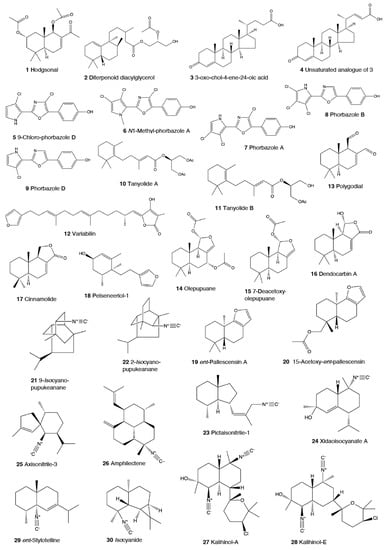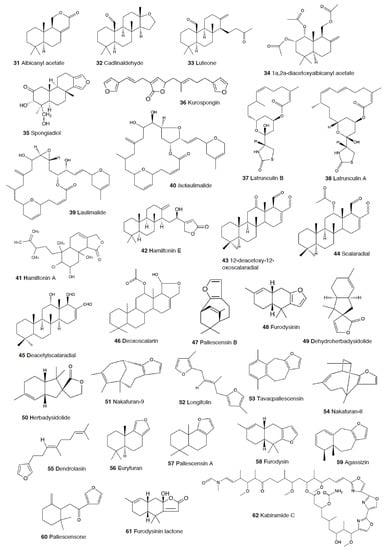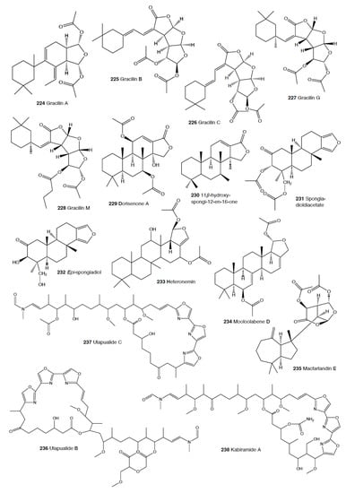 | Chromodoris mandapamensis, Glossodoris cincta | Spongiadiol (35), epi-spongiadiol (232) | Activity against herpes simplex virus, type 1 (HSV-1) and P388 murine leukemia cells | [166,535] |