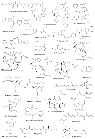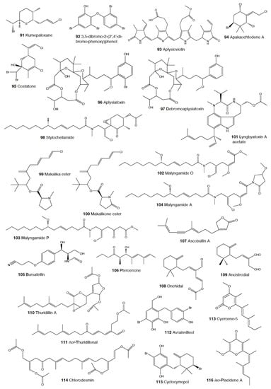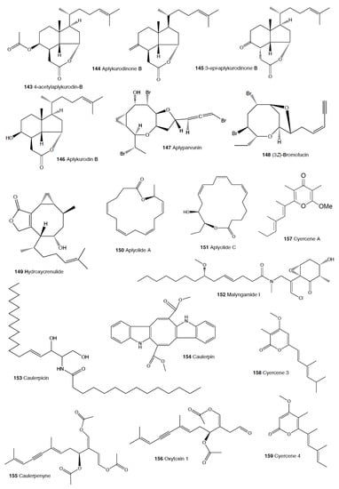 | Stylocheilus longicauda | Aplysiatoxin (96), debromoaplysiatoxin (97), makalika (99), makalikone (100), lyngbyatoxin A (349), lyngbyatoxin A acetate (101), malyngamide B, O (102) and P (103) | Cytotoxic to P388, A549, HT29, and HTB38 cancer cell lines, and toxic to mice | [302,304,305,307,777,778,779] |