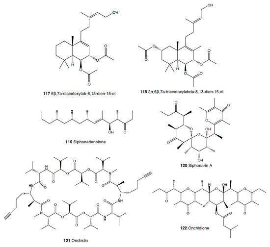 | Siphonaria spp. | Siphonarienolone (119), diemenensins A (165) and B, siphonarin A (120), vallartanones A and B | Cytotoxic | [27,134,340,341,342,343,344,348,351] |