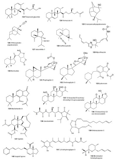 | Glossodoris hikuerensis, G. vespa, G. cincta | Heteronemin (233), scalaradial (44), 12-deacetoxy-12-oxoscalaradial (43), 12-deacetoxy-12-oxo-deoxoscalarin (136), 12-epi-scalaradial | Antibiotic activity | [178] |