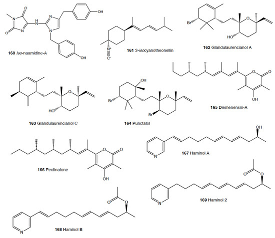 | Aplysia punctata | Glandulaurencianols A–C (162,163), punctatol (164) | Antibacterial activity against B. subtilis and E. coli | [429,430,431] |