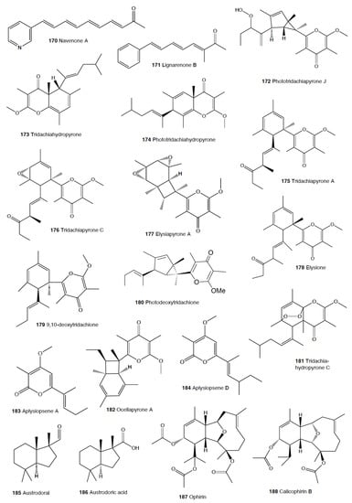 | Leminda millecra | Millecrones A (368) and B (369), millecrols A (370) and B (371) | Antibiotic activity against C. albicans, S. aureus and B. subtilis | [588] |