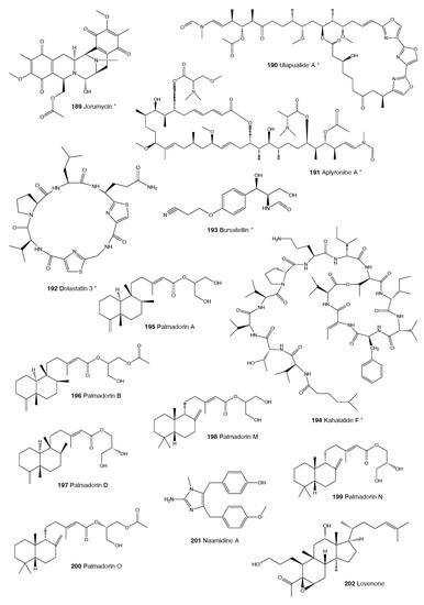 | Dolabella auricularia | Dolabellanin A | Antineoplastic | [435] |