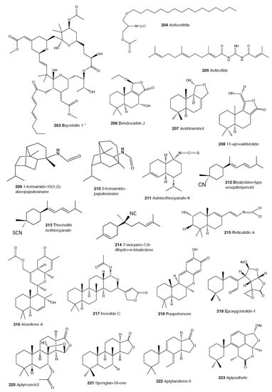 | Phyllidiella rosans | 9-Isocyanopupukeanane (21), epi-9-isocyanopupukeanane | Antibacterial activity against Bacillus subtilis and Candida albicans | [110] |