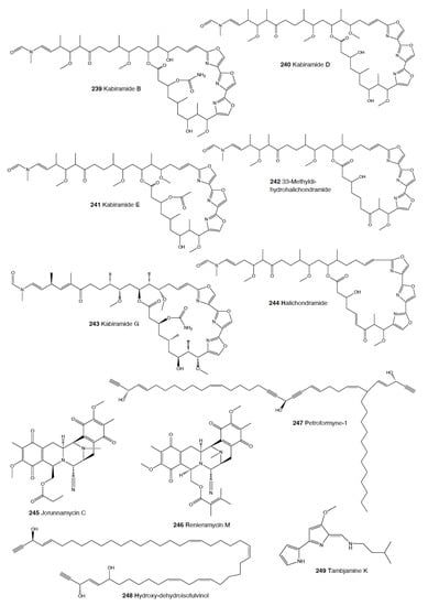 | Hexabranchus sanguineus | Kabiramides A–E (238, 239, 62, 240, 241), sanguinamides A (64), B (366), halichondriamides (244), ulapualides A (190) and B (236) | Antibacterial activity against P. aeruginosa, and antifungal activity against C. albicans | [208,219,221,222,545,834,835,836,837] |