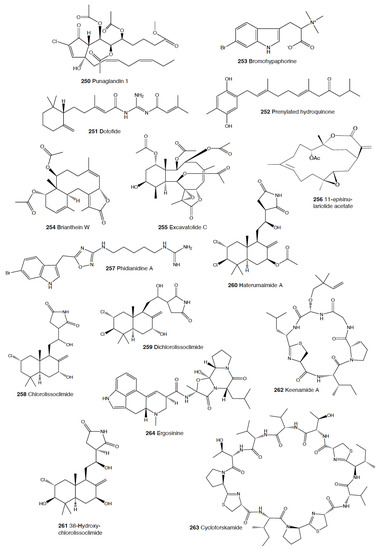 | Tylodina perversa | Iso-fistularin 3 (270) | Cytotoxic to human HeLa cervix carcinoma cells | [257,625] |