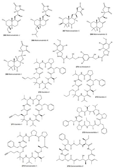 | Philinopsis speciosa | Kulolides 1 (271), 2 (272) and 3 (273), kulokainalide 1 (274), lulokekahilides 1 (275) and 2 (276) | Cytotoxic to L-1210, P388 leukemia, human SK-OV-3 ovarian, tMDA-MB-435 breast cancer, human A549 NSCLC, K562 chronic myelogenous leukemia, HeLa cervix carcinoma, and MCF-7 breast cancer cell lines | [277,626,627,628] |