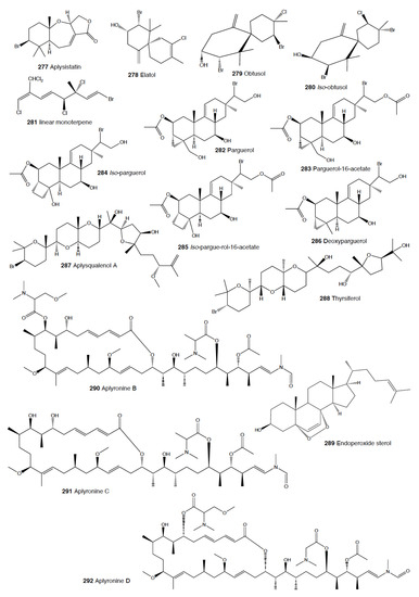| Aplysia dactylomela | Elatol (278), obtusol (279), iso-obtusol (280), linear halogenated monoterpene (281) | Cytotoxic to ten cancer cell lines, B16F10 melanoma, HM02 gastric carcinoma, HEP-G2 liver carcinoma, and MCF-7 breast carcinoma cancer cells | [631,633,632,633] |