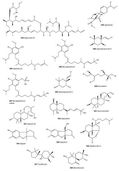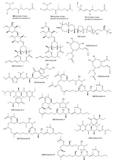 | A. kurodai | Aplysiaterpenoid A (298), aplysiapyranoids A–D (299) | Cytotoxic to Vero, MDCK, and B16 cells | [668,669] |