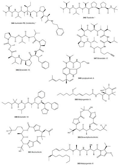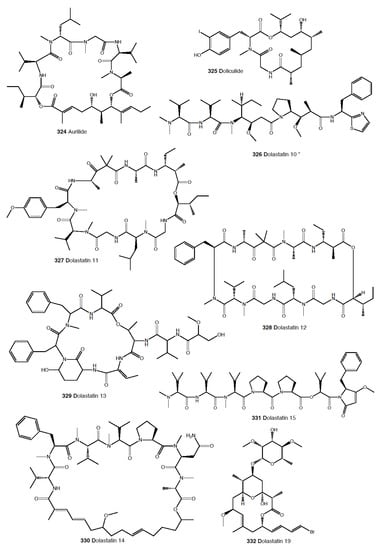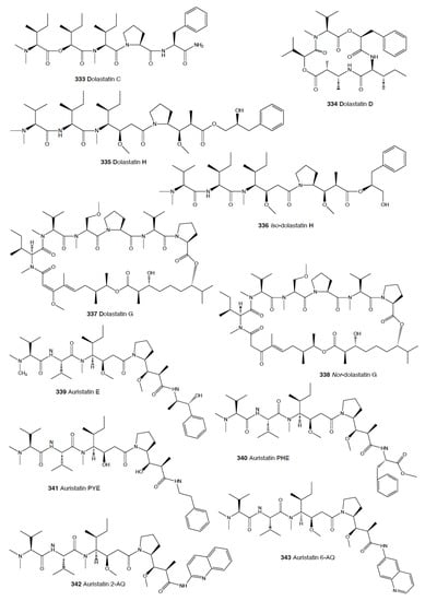 | D. auricularia | Dolastatins 3 (192), 10 (326), 11 (327), 12 (328), 13 (329), 14 (330), 15 (331), 16 (346), 17 (347), 18 (348), 19 (332), C (333), D (334), G (337) and H (335), iso-dolastatin H (336), debromoaplysiatoxin (97), anhydrodebromo-aplysiatoxin, aurilide (324), nor-dolastatin G (338), auristatins E (339), PHE (340), PYE (341), 2-AQ (342), 6-AQ (343) and PE (344), tasidotin (345) | Cytotoxic to renal, ovarian, prostate, hepatobiliary, pancreatic cancer cell lines, P388 murine leukemia, colon 26 cancer, Lewis lung carcinoma, B16 melanoma, M5076 sarcoma, human MX-1 breast cancer, LX-1, MCF-7, colon KM20L2 cancer, and SBC-3 SCLC cell lines | [46,688,694,703,705,717,718,719,721,722,724,744,750,751,766] |