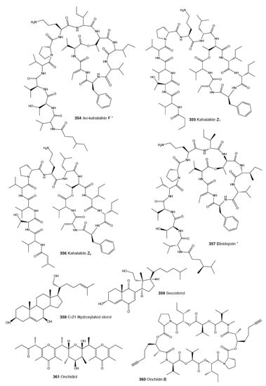 | Bursatella leachii | Lyngbyatoxin A (349), debromoaplysiatoxin (97), hectochlorin (351), deacetylhectochlorin (352), malyndamides S (350) and X (353) | Cytotoxic to murine P388 leukemia, human A549, NSCLC, NCI-H187 (SCLC), HT-29 colon cancer, HL60 leukemia, KB, and BC breast cancer | [783,784,785,786,787] |