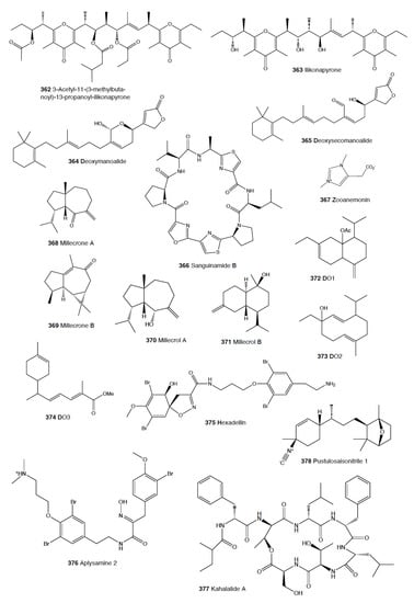 | Dermatobranchus otome | DO1 (372), DO2 (373), DO3 (374) | Antibacterial activity against B. subtilis | [842] |