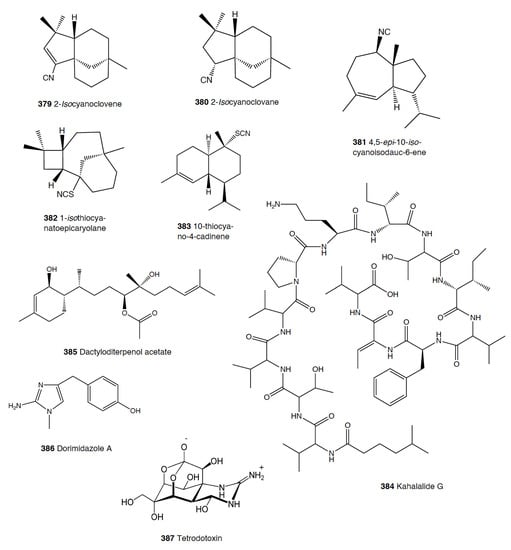 | Phyllidia ocellata | 2-Isocyanoclovene (379), 2-isocyanoclovane (380), 4,5-epi-10-isocyanoisodauc-6-ene (381), 1-isothiocyanatoepicaryolane (382) | Activity against Plasmodium falciparum | [376] |