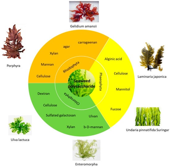 In the utilization of algae resources, algae polysaccharides are an extremely important component. Algae polysaccharides are a multi-component mixture composed of one or more monosaccharides, which are connected with 1, 3 and 1, 4 glycosidic bonds, distributed between and within the algae cells. They are generally water-soluble, and some contain sulfate groups, which provide high viscosity or solidification properties. There are many types of seaweed polysaccharides that arise from different sources, which are divided into Rhodophyta polysaccharides, Fucophyta polysaccharides, Chlorophyta polysaccharides, etc. [2]. The main types of algae and their products are shown in Figure 1.