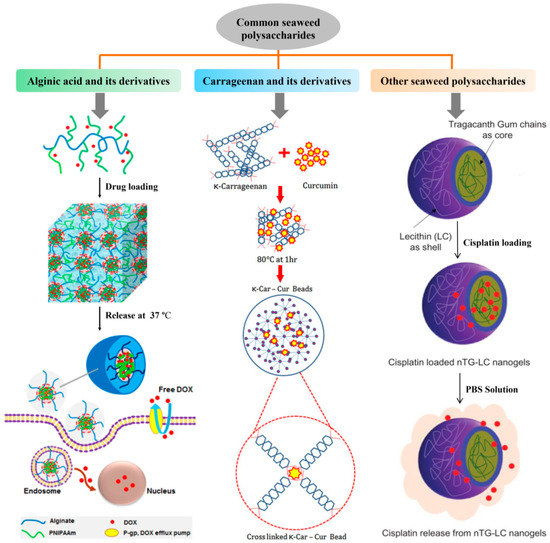 In conclusion, among the wide variety of seaweed polysaccharides, this review is focused on alginic acid and its derivatives in brown algae, carrageenan and its derivatives in red algae, and other kinds of seaweed polysaccharides. Their value is not only limited to anti-inflammatory, bacteriostatic, anticancer and other medicinal values, but also extends to the important potential value in gel drug delivery systems. For example, due to the influence of Ca2+ and Na+ concentration within the plasma, the strength of hydrogels prepared by alginic acid and its derivatives extracted from brown algae increases with increasing cation concentration. And a large number of carboxyl groups make it pH-responsive, so the adaptive hydrogel particles can be applied in the controlled release of drugs in gastrointestinal and tumor microenvironments. Similarly, modified carrageenan is temperature- and pH-responsive. These characteristics are across all seaweed polysaccharides, and the gel particles prepared from them exhibit both intelligent responses and biocompatibility. To summarize, ionic conditions, temperature and pH are the main factors that influence changes in the properties of the gels prepared by seaweed polysaccharides. These properties can be utilized to design gels with intelligent response mechanisms, such as gel films, gel microspheres, nanogels and other intelligent drug delivery gels, and may be applied in the delivery of a wide variety of drugs.