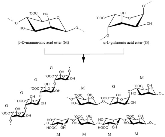 From a structural point of view, alginic acid is a copolymer composed of β-d-manuronic acid (mannuronate, M) and amurl guronic acid (guluronate, G) connected with β-1,4 glycosidic bonds and randomly arranged into poly-GG, poly-MG and poly-MM fragments [20], as shown in Figure 3. The linear polymers contain carboxyl groups in each uronic acid unit, and exhibit clear pH sensitivity [21]. When alginic acid is in the alkali metal salt and ammonium salt state, the solution is neutral or alkaline, and at the same time a high proportion of carboxylate groups (–COO−)result in polyanion electrolyte properties, meaning the aqueous solution has certain adhesion properties. When the pH value increases, the carboxylic acid group (–COOH) continuously dissociates, the molecular chain extends and the solubility increases. However, under acidic conditions, the conversion of –COO− to –COOH is not as facile, the solubility decreases and the molecular chain shrinks. Below pH 3, the alginic acid solution is converted into insoluble alginic acid gel or a precipitate, which is accelerated by the addition of multivalent metal ions (such as calcium chloride) [22].