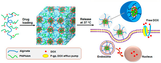 - Liu, M.; Song, X.; Wen, Y.; Zhu, J.L.; Li, J. Injectable Thermoresponsive Hydrogel Formed by Alginate-g-Poly(N-isopropylacrylamide) That Releases Doxorubicin-Encapsulated Micelles as a Smart Drug Delivery System. ACS Appl. Mater. Interfaces 2017, 9, 35673–35682. [Google Scholar] [CrossRef]