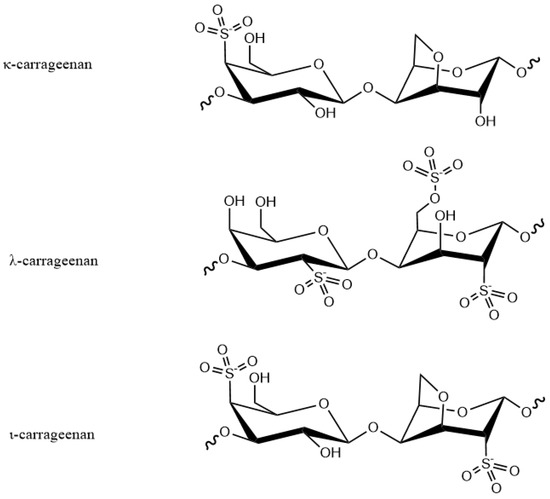 Carrageenan is a linear polysaccharide compound formed from alternating sulfated or non-sulfated galactose units and linked with α-1,3glycosidic bond and β-1,4-galactose bonds. It can carry a sulfate group on the D-galactose unit C-4′ connected at the 1-position and has a molecular weight of more than 200,000. It can be derived from the calcium, potassium, sodium and ammonium salts of the polysaccharides sulfates and composed of various galactose and dehydrated galactose units. In addition, depending on the position at which the semi-ester sulfate group is connected on the galactose unit, it can be divided into seven main types: κ-carrageenan, ι-carrageenan, λ-carrageenan (Figure 5), γ-carrageenan, ν-carrageenan, ξ-carrageenan and μ-carrageenan [39]. The κ-type carrageenan forms a brittle gel with potassium ions and forms a soft, elastic gel on interaction with calcium ions; λ-carrageenan does not form a gel when combined with a salt. Generally, the carrageenan produced from algae is not a pure version of one of the above products, but exists in a mixture.
