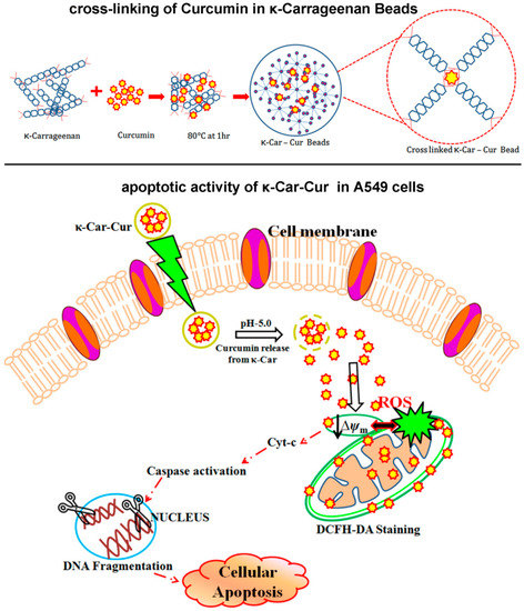 Schematic representation of cross-linking phenomenon of developed κ-Car-Cur materials and its mechanism of action. Reproduced with permission from [45]. Carbohydr. Polym, 2017.