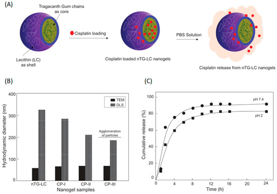 (A) Schematic representation for the designing and development of cisplatin (CP) loaded nTG-LC nanogel and their properties. (B) Hydrodynamic diameter of nTG-LC and varying concentration of CP loaded nTG-LC nanogel. CP-I, 1.2%, CP-II, 5.2% and CP-III, 8.5%. (C) CP release from nTG-LC-CP (5.2% CP) in PBS at different pH 2 and 7.4. Reproduced with permission from [91]. Int. J. Polym. Mater, 2020.