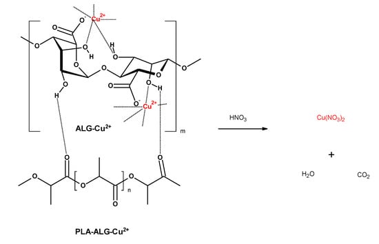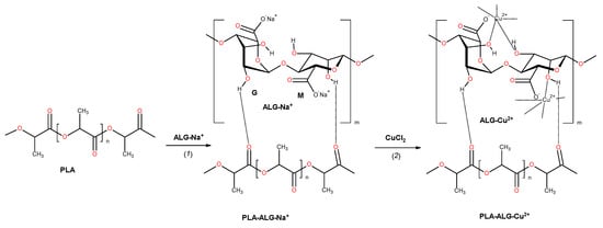The preparation of PLA–ALG–Cu2+ composites wase performed by treating of PLA nonwovens with aqueous solutions of sodium alginate, during which alginate underwent adhesion to the PLA surface. In the second stage of the procedure, solution of copper chloride was added and consequently copper ions substituted sodium ions, and in turn initiated a cross-linking reaction with subsequent sol transition. The reactions involved in the fibrous composite preparation are depicted schematically in Figure 1.
