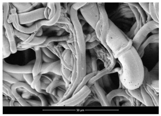 Non–modified samples of polylactide nonwoven (PLA) as well as alginate–modified polylactide nonwoven (PLA–ALG–Na+) did not inhibit the growth of Aspergillus niger or of Chaetomium globosum fungus, either around the samples or in the contact zone with the culture media. In addition, strong fungal growth covering of the entire surface of the samples was visible (Figure 12a and Figure 13a).