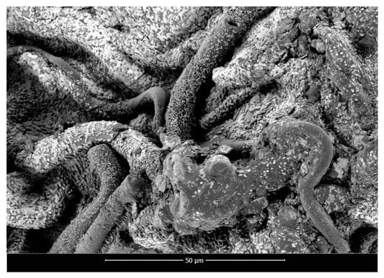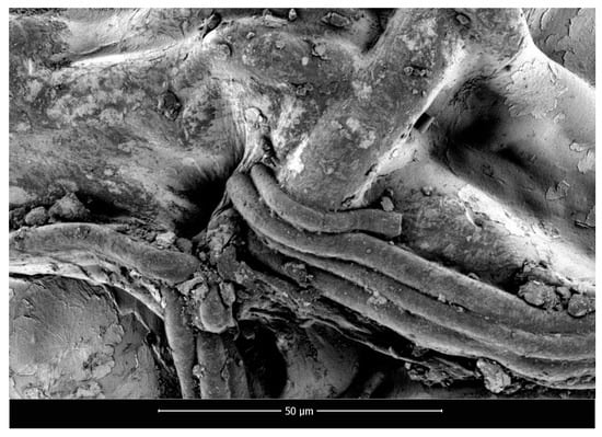 Figure 4 illustrates the surface of the PLA–ALG–Cu2+-2 composite (charged with ~7.6% of Cu2+), with the agglomerates, presumably composed of ALG–Cu2+, visible over the entire surface of the sample. Similarly as in the case of the PLA–ALG–Na+ sample, only the fibers with the diameter higher than ~4. µm are distinguishable and the majority of pores are covered by the coating. Moreover, the surface of the PLA–ALG–Cu2+ composite is less uniform and rougher due to the presence of numerous agglomerates.