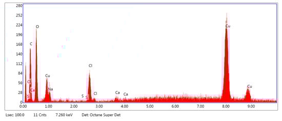 Example of the EDS spectrum of the PLA–ALG–Cu2+-1.