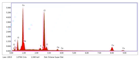 Quantitative EDS analysis (Table 1) exhibited that the modification of PLA with alginate led to an increase in carbon concentration (from 51.70 at. % to 71.41 at. %). Simultaneously, a decrease in the oxygen content (from 48.33 at. % to 28.42 at. %) was observed. Additionally, for the PLA–ALG–Na+ composite a small concentration of sodium was detected (0.10 at. %). Furthermore, the obtained results indicate that the content of Cu and Cl significantly increased when the concentration of CuCl2 in the surface modifier changed from 5% to 10%. In the case of the PLA–ALG–Cu2+-1 sample, the content of copper was 0.92 at. %, while the chloride concentration was 1.93 at. % (Figure 5). For the PLA–ALG–Cu2+-2 composite the concentrations of copper and chloride rose to 15.06 at. % and 21.44 at. %, respectively (Figure 6). At the same time, with the increase of CuCl2 concentration from 5% to 10%, the carbon content dropped to 55.25 at. % and 35.16 at. %, while sodium content increased to 0.78 at. % and 5.87 at. %, accordingly. In the case of oxygen concentration, at first an increase of up to 40.95 at. % was observed for the PLA–ALG–Cu2+-1 sample, followed by a decrease to 19.96 at. % for the PLA–ALG–Cu2+-2 composite. As far as calcium and sulfur contents were concerned, both rose with the increase in the CuCl2 concentration, however, the observed values did not exceed 1.5 at. % and thus, may be regarded as a contamination. The observed high standard deviation values indicates that the distribution of chemical components was not uniform and homogeneous.