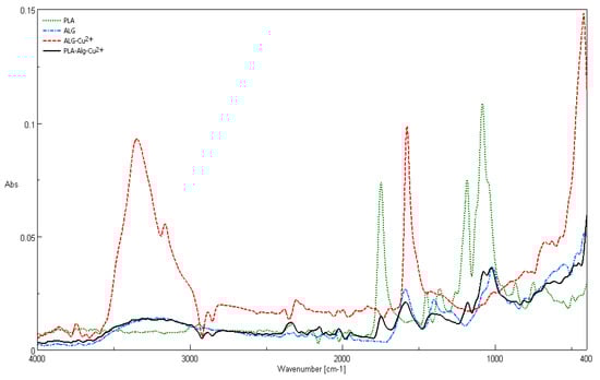 The recorded ATR–FTIR spectra for polylactide nonwoven, alginic acid sodium salt (ALG–Na+), ALG–Cu2+ complex, and PLA–ALG–Cu2+-2 composite are presented in Figure 8. Characteristic FTIR signals of the composite and its components (PLA, ALG–Na+, and ALG–Cu2) are summarized in Table 3 [,,,,,,,,].