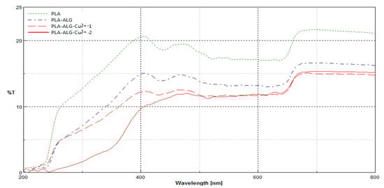 Figure 9 presents spectrophotometric transmittance spectrum in the wavelength λ = 200–800 nm of PLA nonwoven and PLA–ALG–Na+ and PLA–ALG–Cu2+ (PLA–ALG–Cu2+-1 and PLA–ALG–Cu2+-2) composites.