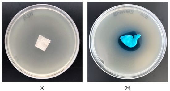 The polylactide/alginate/copper (PLA–ALG–Cu2+) composites’ antimicrobial activity tests. Inhibition zones of Escherichia Coli bacterial growth on Petri dishes, sample: (a) PLA and (b) PLA–ALGCu2+−2.