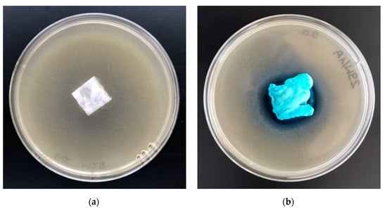 The polylactide/alginate/copper (PLA–ALG–Cu2+) composites’ antimicrobial activity tests. Inhibition zones of Staphylococcus aureus bacterial growth on Petri dishes, sample: (a) PLA and (b) PLA–ALG–Cu2+−2.